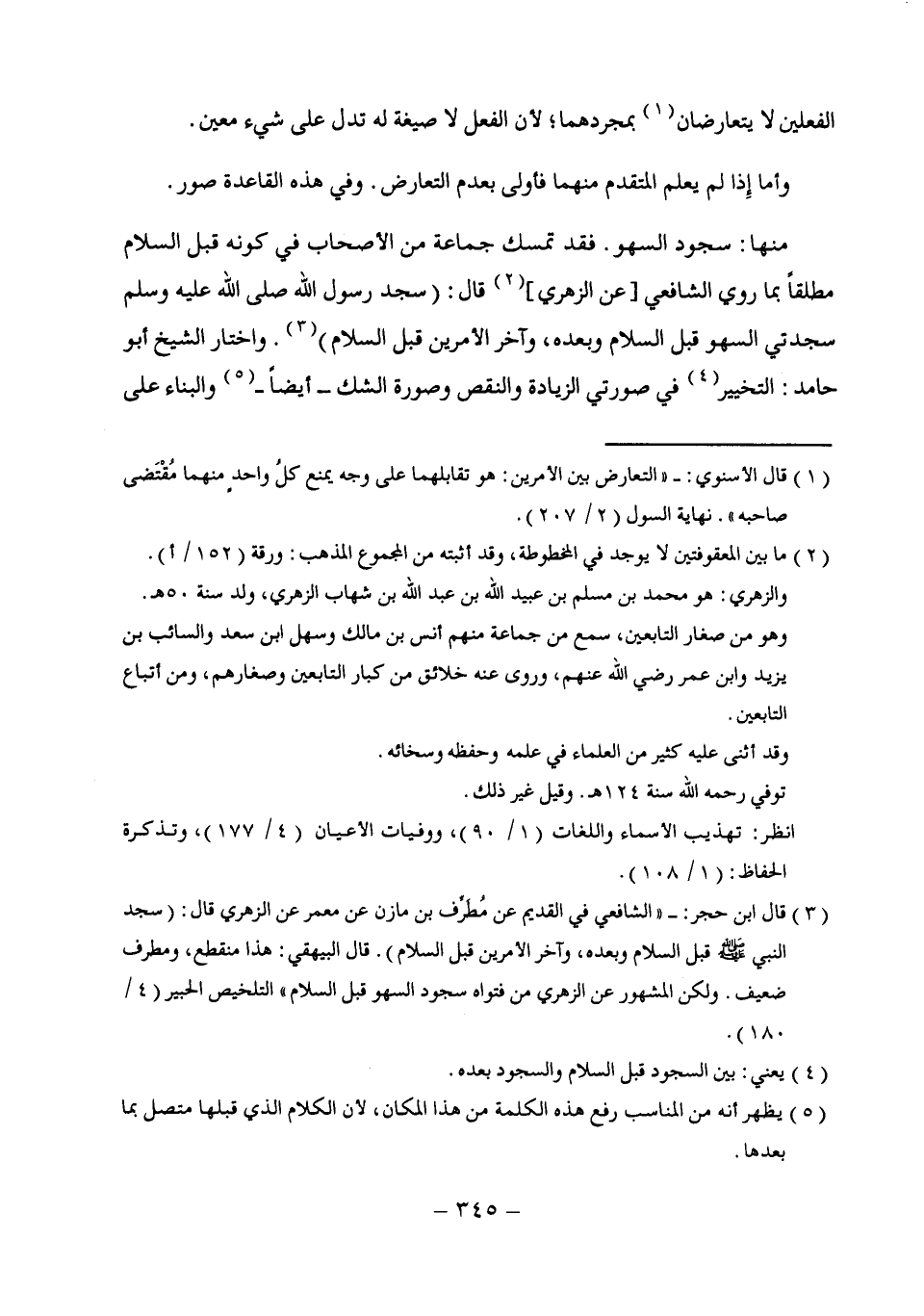 (¬3) قال ابن حجر: - "الشافعي في القديم عن مطرف بن مازن عن معمر عن الزهرى قال: (سجد النبي - صلى الله عليه وسلم - قبل السلام وبعده، وآخر الأمرين قبل السلام). قال البيهقي: هذا منقطع، ومطرف ضعيف. ولكن المشهور عن الزهرى من فتواه سجود السهو قبل السلام" التلخيص الحبير (4/ 180).