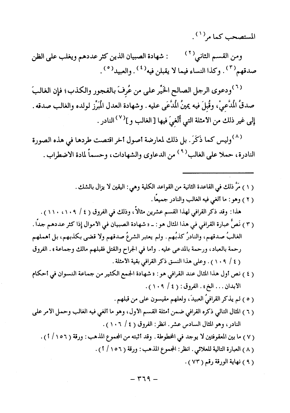 (¬3) نَصُّ عبارة القرافي في هذا المثال هو: "شهادة الصبيان في الأموال إذا كثر عددهم جدًا. الغالبُ صدقهم، والنادرُ كذبُهم. ولم يعتبر الشرعُ صدقهم ولا قضى بكذبهم، بل أهملهم رحمة بالعباد، ورحمة بالمدعى عليه. وأما في الجراح والقتل فقبلهم مالك وجماعة". الفروق (4/ 109). وعلى هذا النسق ذكر القرافي بقية الأمثلة.