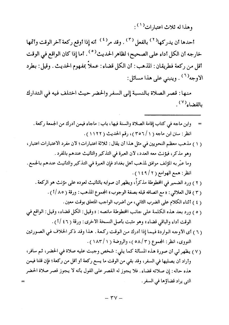 (¬7) يظهر لي أن صررة هذه المسألة كما يلي: شخص وجبت عليه صلاة في الحضر، ثم سافر، وأراد أن يصليها في السفر، وقد بقي من الوقت ما يسع ركعة أو أقل من ركعة، فإِن قلنا فيمن هذه حاله: إِن صلاته قضاء. فلا يجوز له القصر على القول بأنه لا يجوز قصر صلاة الحضر التى يراد قضاؤها في السفر. =