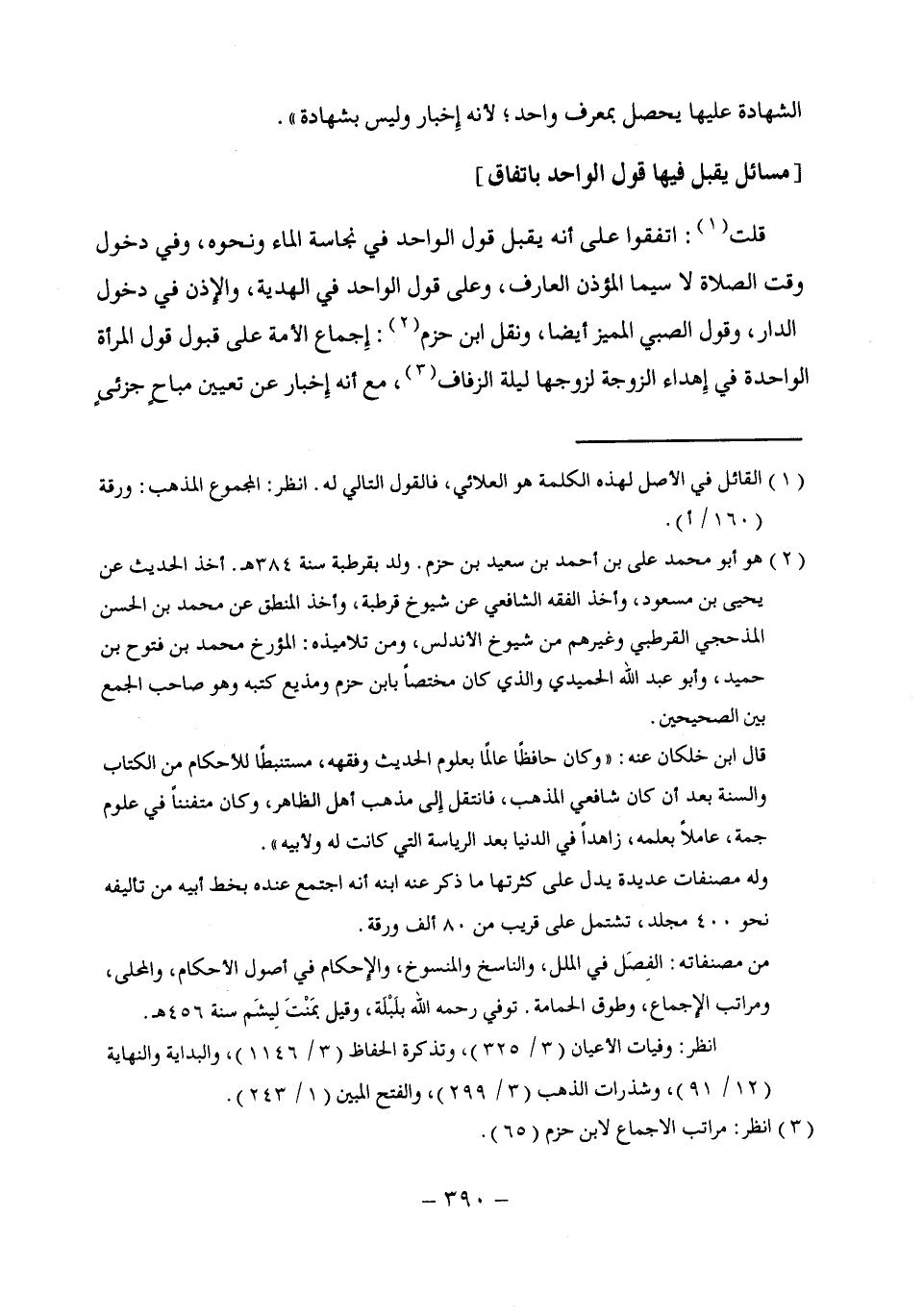 قلت (¬1): اتفقوا على أنه يقبل قول الواحد في نجاسة الماء ونحوه، وفي دخول وقت الصلاة لا سيما المؤذن العارف، وعلى قول الواحد في الهدية، والأذن في دخول الدار، وقول الصبي المميز أيضا، ونقل ابن حزم (¬2): إِجماع الأمة على قبول قول المرأة الواحدة في إِهداء الزوجة لزوجها ليلة الزفاف (¬3)، مع أنه إِخبار عن تعيين مباحٍ جزئىٍ
