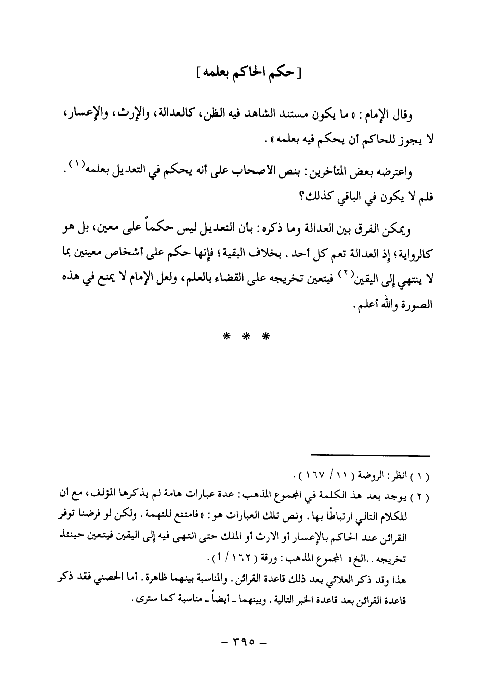 وقال الإمام: "ما يكون مستند الشاهد فيه الظن، كالعدالة، والإِرث، والإعسار، لا يجوز للحاكم أن يحكم فيه بعلمه".