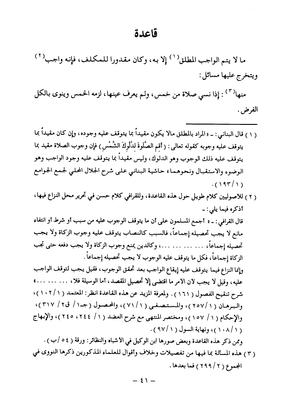 (¬2) للأصوليين كلام طويل حول هذه القاعدة، وللقرافى كلام حسن في تحرير محل النزاع فيها، أذكره فيما يلي: -