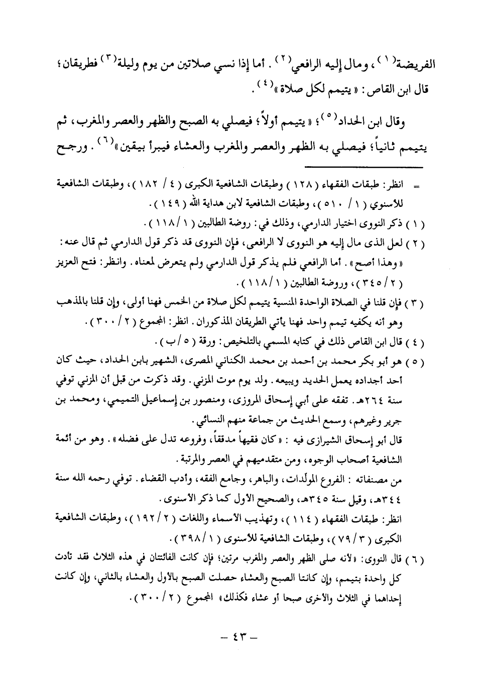 (¬2) لعل الذى مال إليه هو النووى لا الرافعى، فإِن النووى قد ذكر قول الدارمي ثم قال عنه: "وهذا أصح". أما الرافعي فلم يذكر قول الدارمي ولم يتعرض لمعناه. وانظر: فتح العزيز (2/ 345)، وروضة الطالبين (1/ 118).