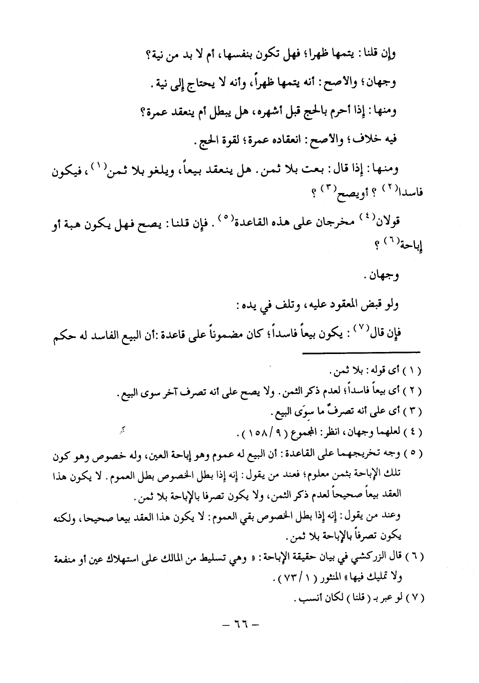 (¬5) وجه تخريجهما على القاعدة: أن البيع له عموم وهو إِباحة العين، وله خصوص وهو كون تلك الإباحة بثمن معلوم، فعند من يقول: إِنه إذا بطل الخصوص بطل العموم. لا يكون هذا العقد بيعاً صحيحاً لعدم ذكر الثمن، ولا يكون تصرفا بالإباحة بلا ثمن.