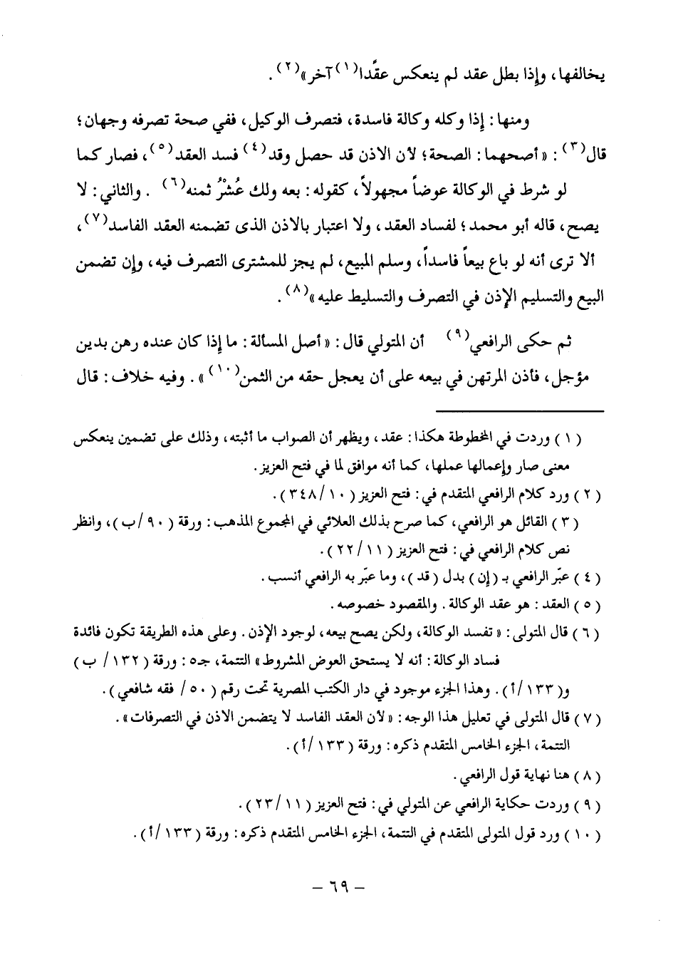 (¬6) قال المتولى: "تفسد الوكالة، ولكن يصح بيعه؛ لوجود الإِذن. وعلى هذه الطريقة تكون فائدة فساد الوكالة: أنه لا يستحق العوض المشروط" التتمة، جـ 5: ورقة (132 / ب) و (133 / أ). وهذا الجزء موجود في دار الكتب المصرية تحت رقم (50 / فقه شافعي).