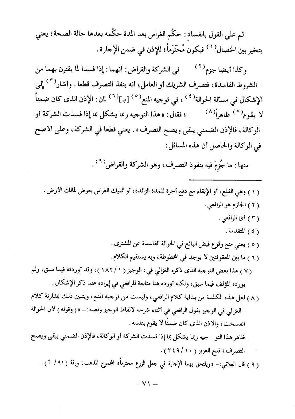 ظاهر هذا التوجيه ربما يشكل بما إِذا فسدت الشركة أو الوكالة، فالإذن الضمني يبقى ويصح التصرف" فتح العزيز (10/ 349).
