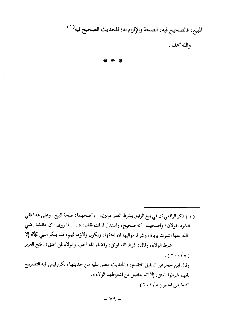 (¬1) ذكر الرافعي أن في بيع الرقيق بشرط العتق قولين، وأصحهما: صحة البيع. وعلى هذا ففي الشرط قولان، وأصحهما: أنه صحيح، واستدل لذلك فقال: " ... لما روى: أن عائشة رضي الله عنها اشترت بريرة، وشرط مواليها أن تعتقها، ويكون ولاؤها لهم، فلم ينكر النبي - صلى الله عليه وسلم - إِلا شرط الولاء، وقال: شرط الله أوثق، وقضاء الله أحق، والولاء لمن أعتق". فتح العزيز (8/ 200).