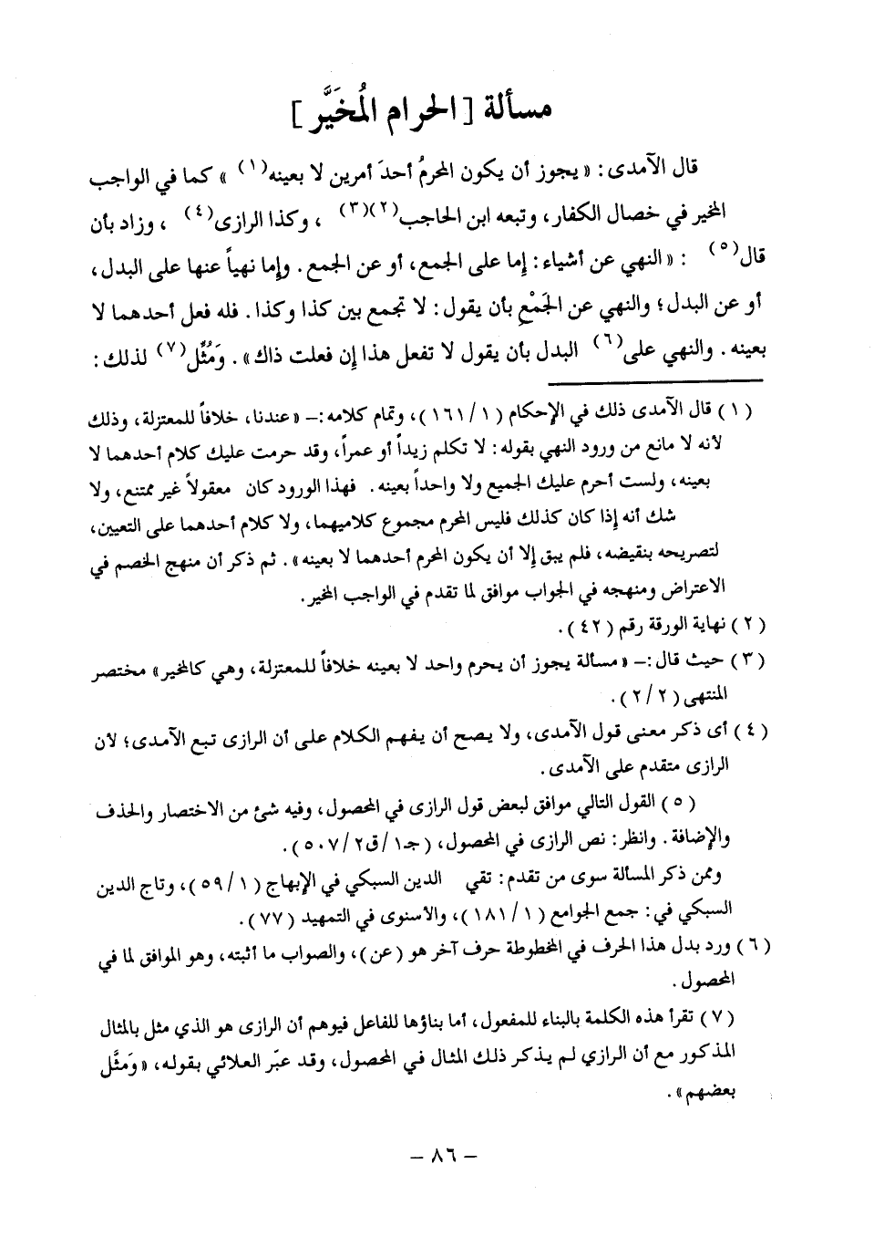 (¬3) حيث قال: - "مسألة يجوز أن يحرم واحد لا بعينه خلافاً للمعتزلة، وهي كالخير" مختصر المنتهى (2/ 2).