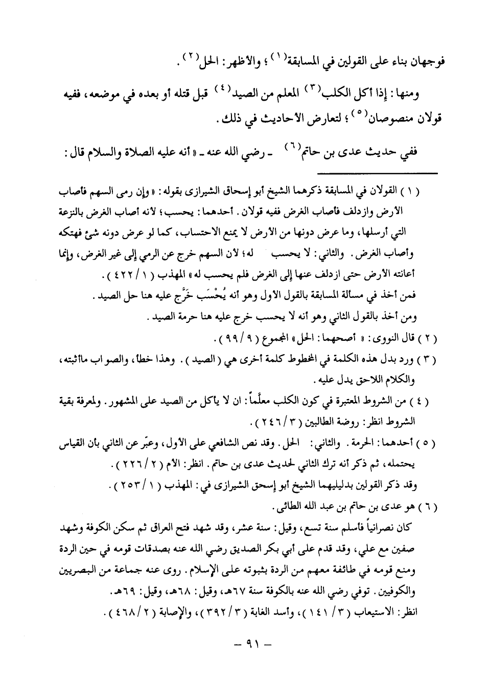 (¬5) أحدهما: الحرمة. والثاني: الحل. وقد نص الشافعي على الأول، وعبّر عن الثاني بأن القياس يحتمله، ثم ذكر أنه ترك الثاني لحديث عدى بن حاتم. انظر: الأم (2/ 226).