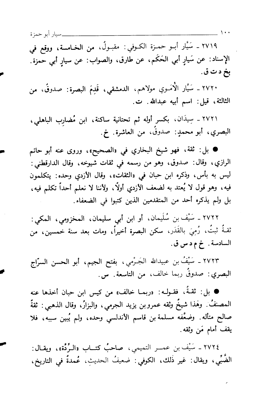 2719 - سَيَّار أبو حمزة الكوفي: مقبولٌ، من الخامسة، ووقع في الإِسناد: عن سَيارٍ أبي الحَكَم، عن طارق، والصواب: عن سيارٍ أبي حمزة. بخ د ت ق.