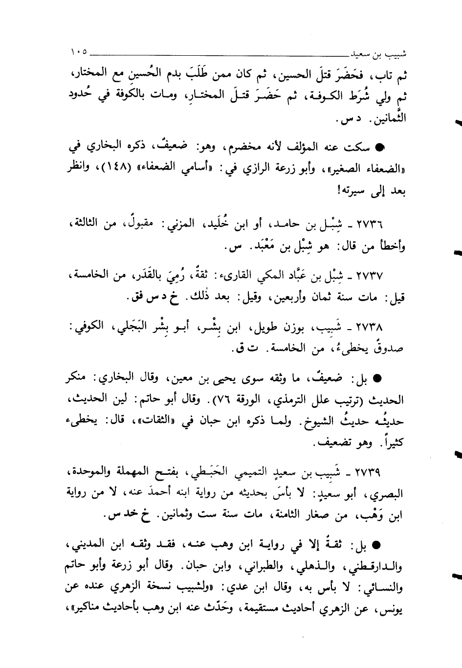 2739 - شَبِيب بن سعيدٍ التميمي الحَبَطي، بفتح المهملة والموحدة، البصري، أبو سعيدٍ: لا بأسَ بحديثه من رواية ابنه أحمدَ عنه، لا من رواية ابن وَهْب، من صغار الثامنة، مات سنة ست وثمانين. خ خد س.