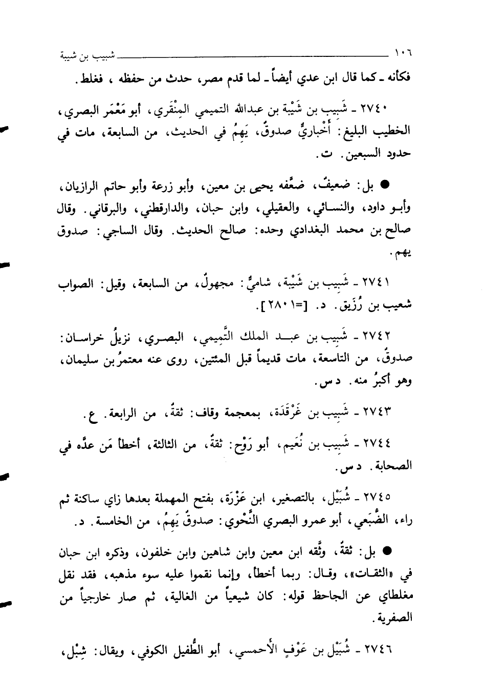 2740 - شَبيب بن شَيْبة بن عبد الله التميمي المِنْقَري، أبو مَعْمَر البصري، الخطيب البليغ. أَخْباريٌّ صدوقٌ، يَهِمُ في الحديث، من السابعة، مات في حدود السبعين. ت.
