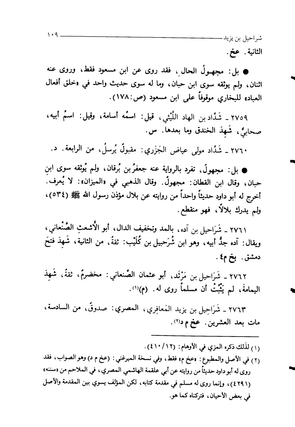 2762 - شَرَاحيل بن مَرْثَد، أبو عثمان الصَّنعاني: مخضرمٌ، ثقةٌ، شَهِدَ اليمامةَ، لم يَثْبُتْ أن مسلمًا روى له. (م) (¬1).