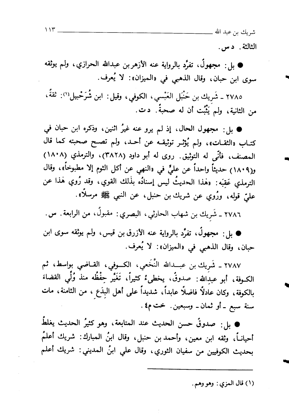 2787 - شَرِيك بن عبد الله النَّخَعي، الكوفي، القاضي بواسط، ثم الكوفة، أبو عبدِ الله: صدوقٌ، يخطئُ كثيرًا، تَغَيَّر جفْظُه منذ وُلِّي القضاءَ بالكوفة، وكان عادلًا فاضلًا عابدًا، شديدًا على أهل البِدَعِ، من الثامنة، مات سنة سبع - أو ثمان - وسبعين. خت م 4.