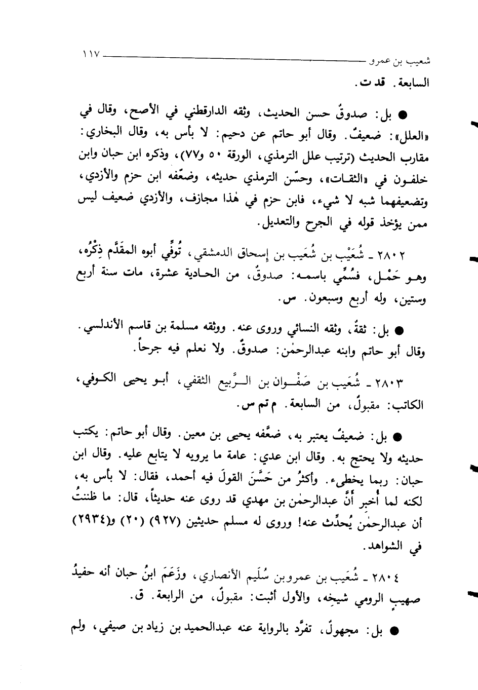 2804 - شعَيب بن عمرو بن سُلَيم الأنصاري، وزَعَمَ ابنُ حبان أنه حفيدُ صهيبٍ الرومي شيخِه، والأول أثبت: مقبولٌ، من الرابعة. ق.