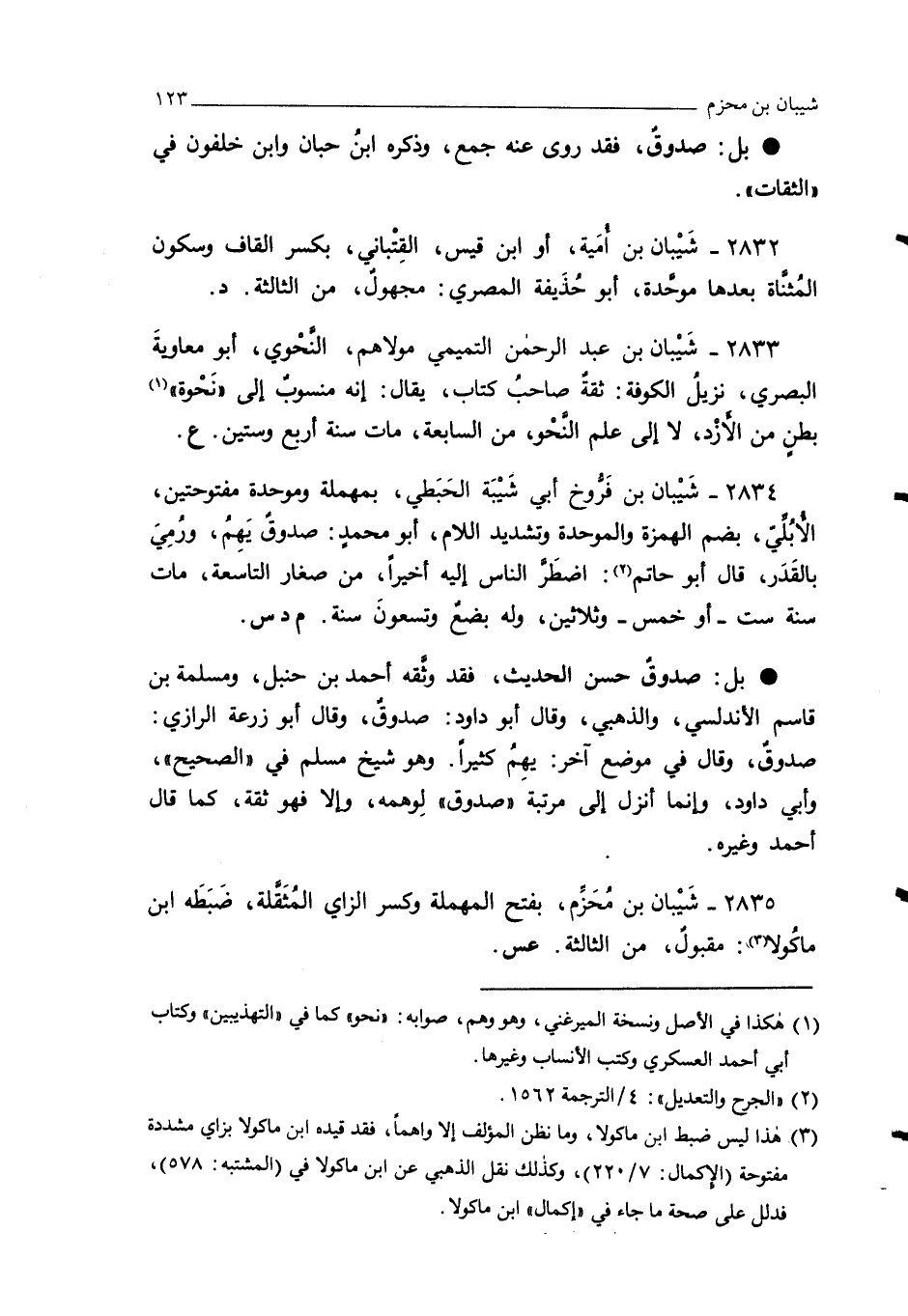 2835 - شَيْبان بن مُحَزِّم، بفتح المهملة وكسر الزاي المُثَقَّلة، ضَبَطَه ابن ماكُولا (¬3): مقبول، من الثالثة. عس.