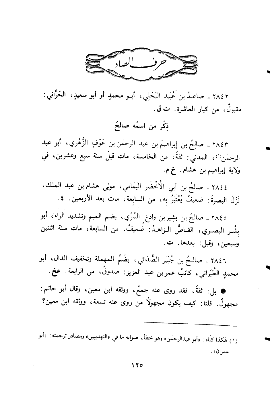 2846 - صالحُ بن جُبَيْر الصُّدَائي، بضَمِّ المهملة وتخفيف الدال، أبو محمدٍ الطبَراني، كاتبُ عمر بن عبد العزيز: صدوقٌ، من الرابعة. عخ.