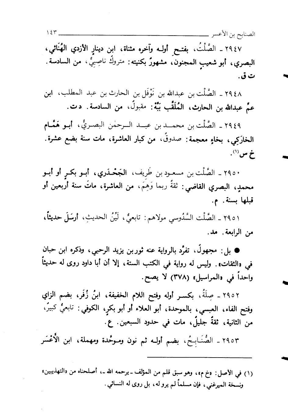 2949 - الصَّلْت بن محمد بن عبد الرحمن البصريُّ، أبو هَمَّام الخارَكِي، بخاءٍ معجمة: صدوقٌ، من كبار العاشرة، مات سنة بضع عشرة. خ س (¬1).