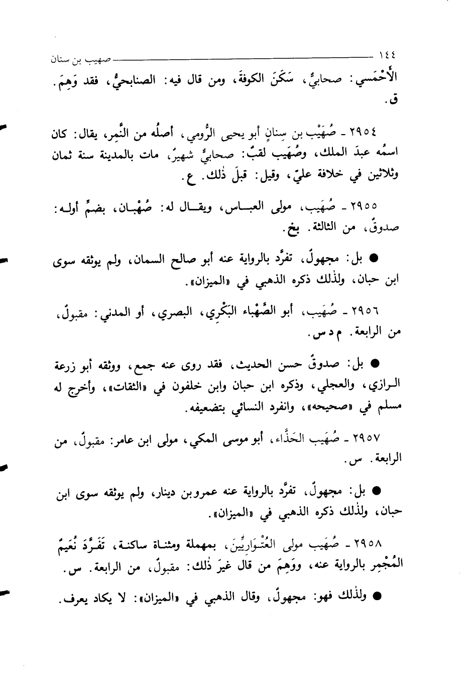2954 - صُهَيْب بن سِنانٍ أبو يحيى الرُّومي، أصلُه من النَّمِر، يقال: كان اسمُه عبدَ الملك، وصُهَيب لقبٌ: صحابيٌّ شهيرٌ، مات بالمدينة سنة ثمان وثلاثين في خلافة عليّ، وقيل: قبلَ ذلك. ع.