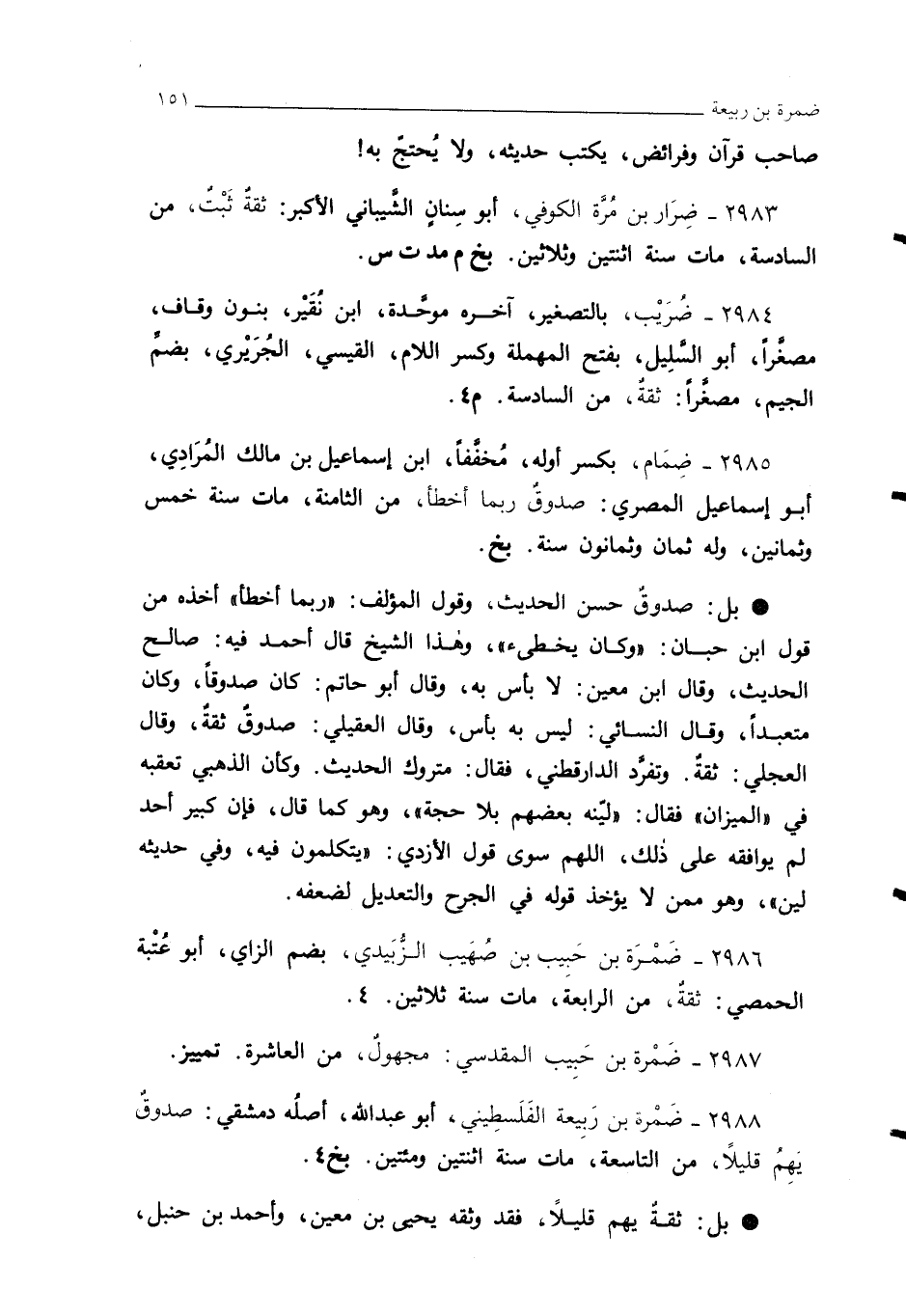 2988 - ضَمْرة بن رَبيعة الفَلَسطِيني، أبو عبد الله، أصلُه دمشقي: صدوقٌ يهِمُ قليلًا، من التاسعة، مات سنة اثنتين ومئتين. بخ 4.