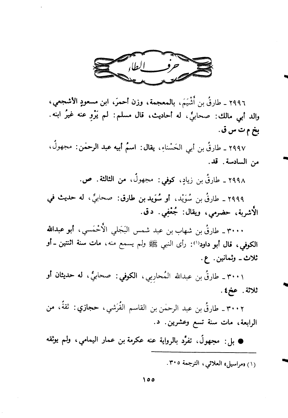 3001 - طارقُ بن عبد الله المُحارِبِي، الكوفي: صحابيٌّ، له حديثان أو ثلاثة. عخ 4.