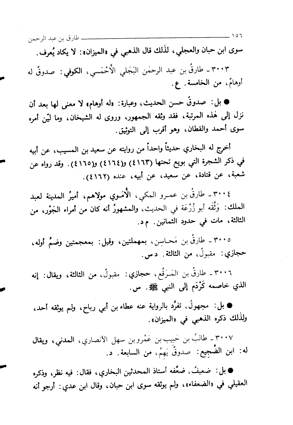 3004 - طارقُ بن عمرو المكي، الأُمَوي مولاهم، أميرُ المدينة لعبد الملك: وَثَّقَه أبو زُرْعَة في الحديث، والمشهورُ أنه كان من أمراء الجَوْر، من الثالثة، مات في حدود الثمانين. م د.