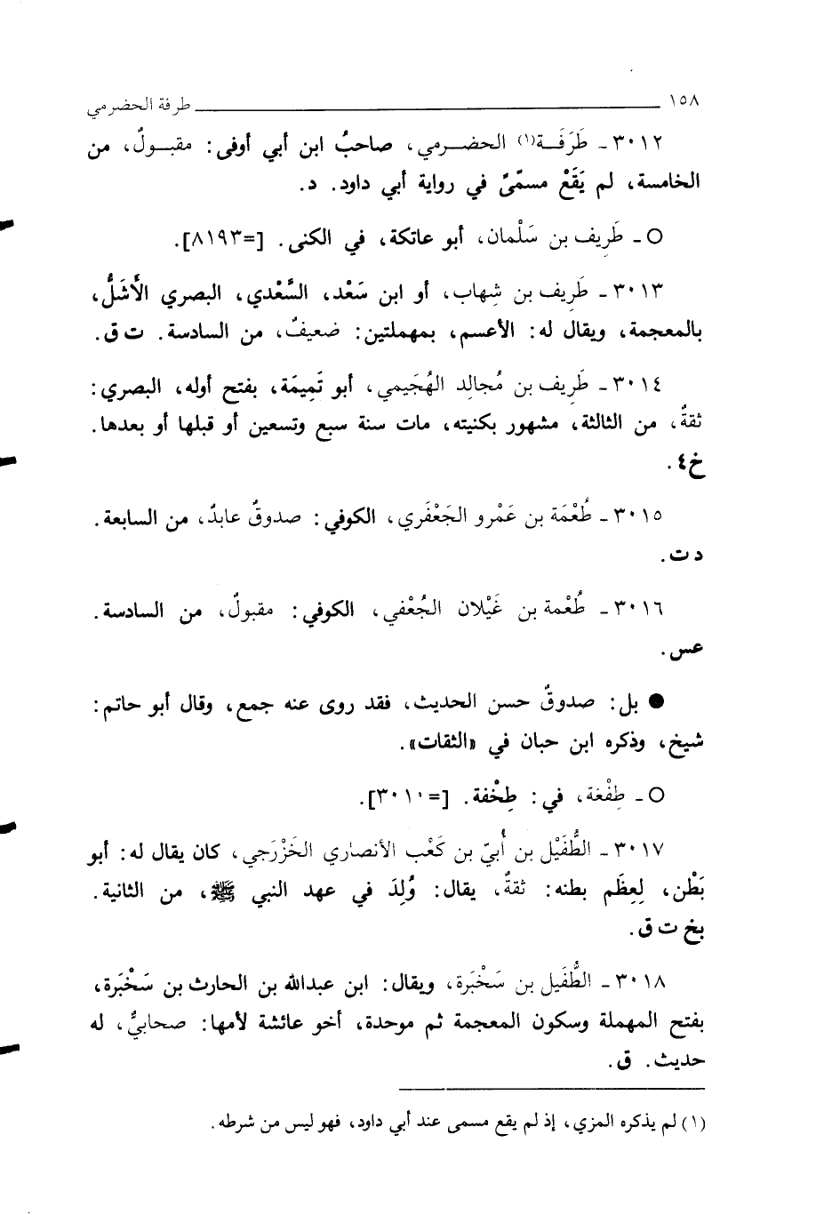 3012 - طَرَفَة (¬1) الحضرمي، صاحبُ ابن أبي أوفى: مقبولٌ، من الخامسة، لم يَقَعْ مسمَّىً في رواية أبي داود. د.