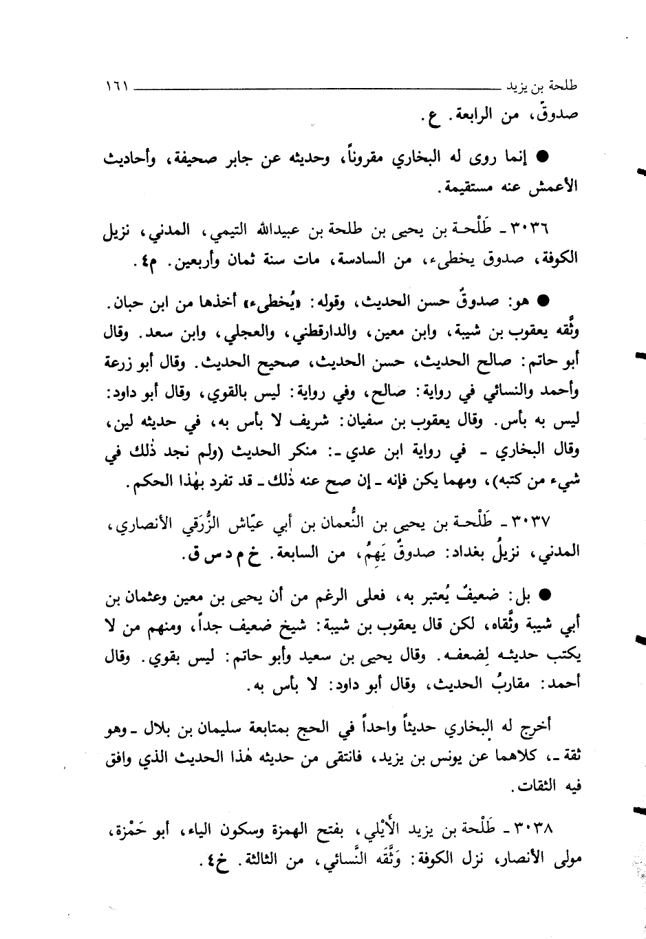 3037 - طَلْحة بن يحيى بن النُّعمان بن أبي عيّاش الزُّرَقي الأنصاري، المدني، نزيلُ بغداد: صدوقٌ يَهِمُ، من السابعة. خ م د س ق.
