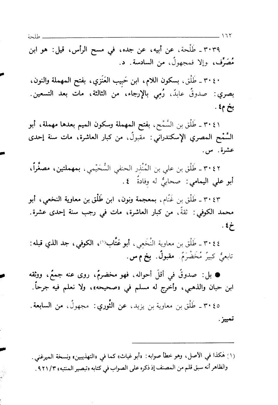 3039 - طَلْحة، عن أبيه، عن جده، في مسح الرأس، قيل: هو ابن مُصَرِّف، وإلا فمجهولٌ، من السادسة. د.
