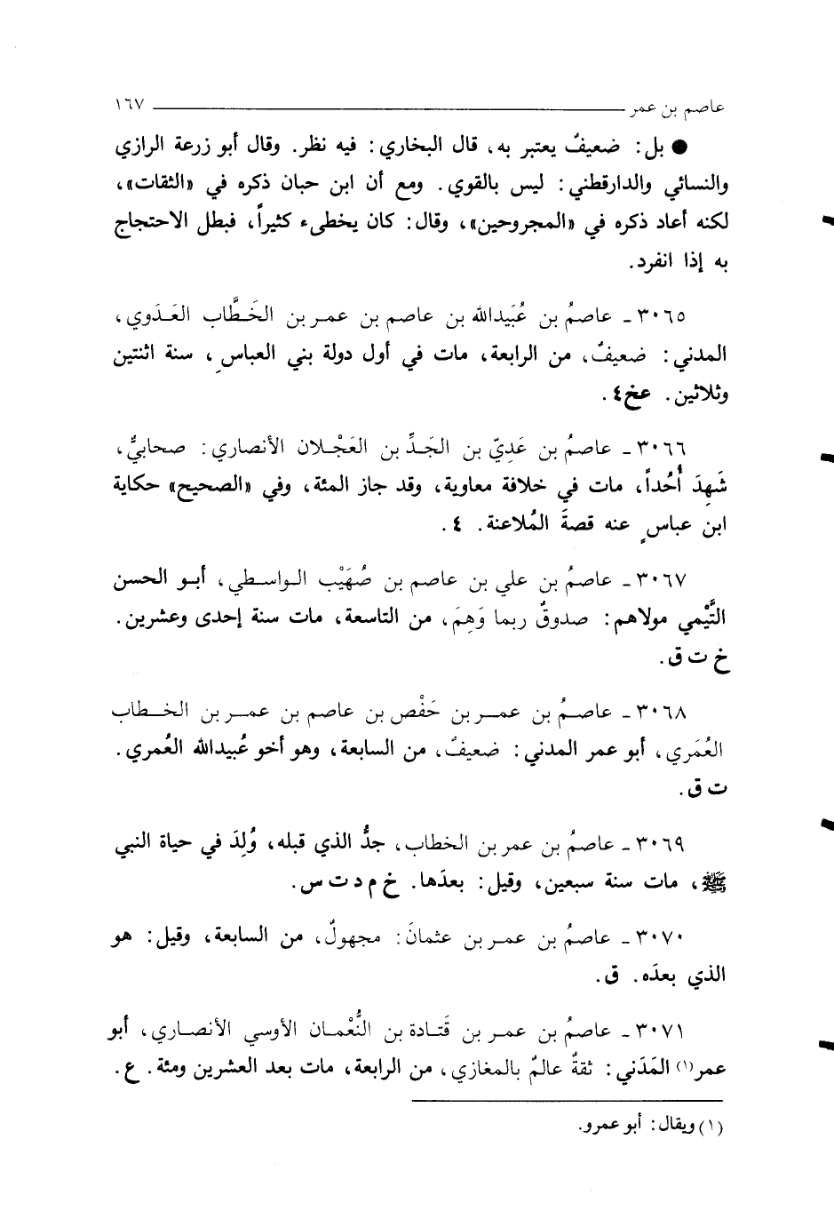 3070 - عاصمُ بن عمر بن عثمانَ: مجهولٌ، من السابعة، وقيل: هو الذي بعدَه. ق.