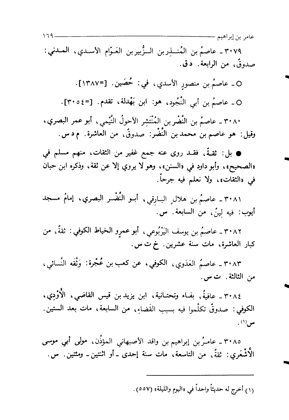 3085 - عامرُ بن إبراهيم بن واقد الأصبهاني المؤذِّن، مولى أبي موسى الأَشْعَري: ثقةٌ، من التاسعة، مات سنة إحدى - أو اثنتين - ومئتين. س.
