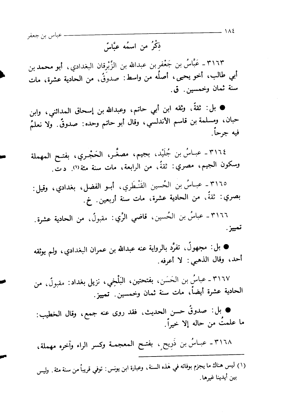 3167 - عباسُ بن الحَسَن، بفتحتين، البَلْخِي، نزيل بغداد: مقبول، من الحادية عشرة أيضًا، مات سنة ثمان وخمسين. تمييز.