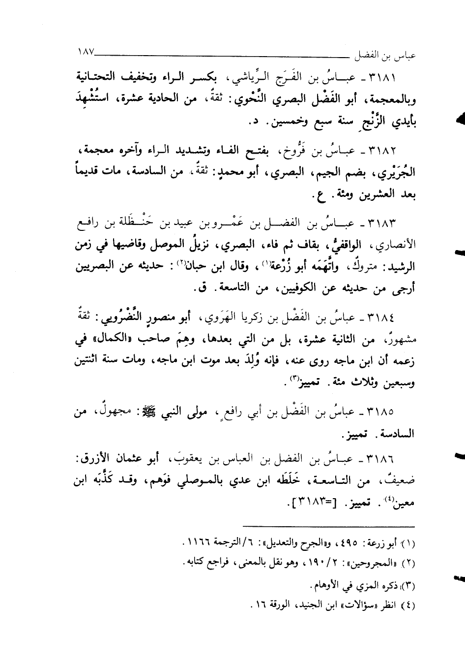 3186 - عباس بن الفضل بن العباس بن يعقوبَ، أبو عثمان الأزرق: ضعيفٌ، من التاسعة، خَلَطَه ابن عدي بالموصلي فوَهم، وقد كَذَّبَه ابن معين (¬4). تمييز. [=3183].