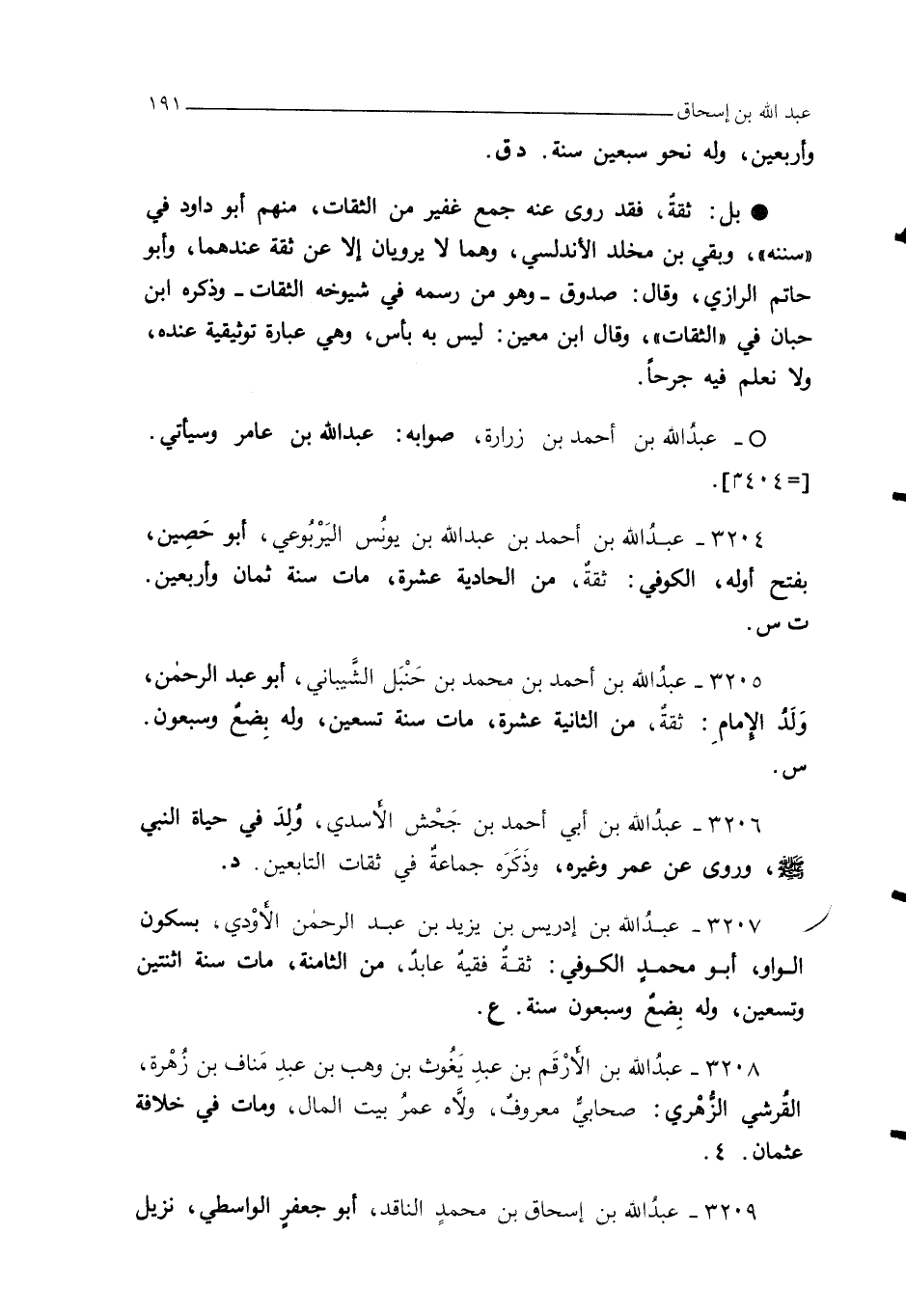 3205 - عبدُ الله بن أحمد بن محمد بن حنبل الشيباني، أبو عبد الرحمن، وَلدُ الإمامِ: ثقة، من الثانية عشرة، مات سنه تسعين، وله بِضع وسبعون.