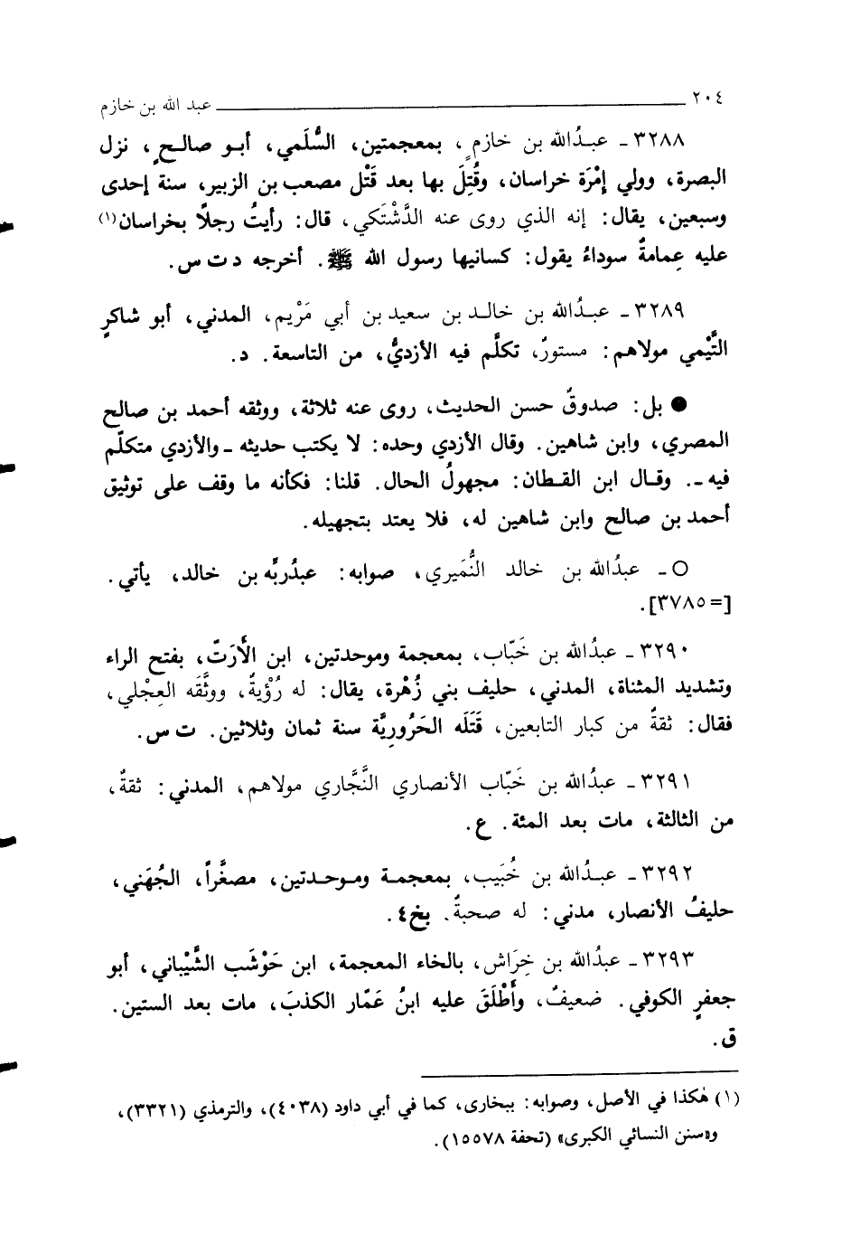 3290 - عبدُ الله بن خَبّاب، بمعجمة وموحدتين، ابن الأرَتّ، بفتح الراء وتشديد المثناة، المدني، حليف بني زُهْرة، يقال: له رُؤْيةً، ووثَّقَه العِجْلي، فقال: ثقةٌ من كبار التابعين، قَتَلَه الحَرُورِيَّة سنة ثمان وثلاثين. ت س.
