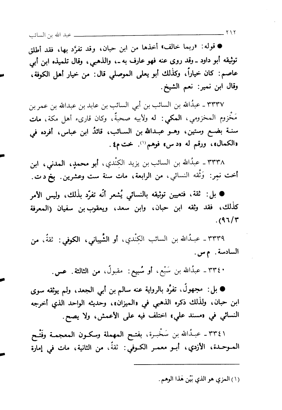 3338 - عبدُ الله بن السائب بن يزيد الكِنْدي، أبو محمدٍ، المدني، ابن أخت نمِر: وَثَقه النسائي، من الرابعة، مات سنة ست وعشرين. بخ دت.