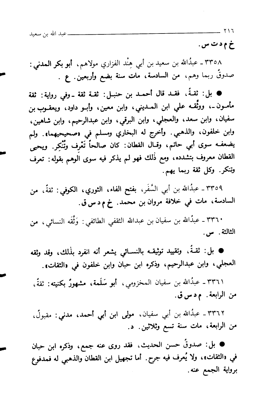 3358 - عبدُ الله بن سعيد بن أبي هِنْد الفزاري مولاهم، أبو بكر المدني: صدوقٌ ربما وهم، من السادسة، مات سنة بضع وأربعين. ع.