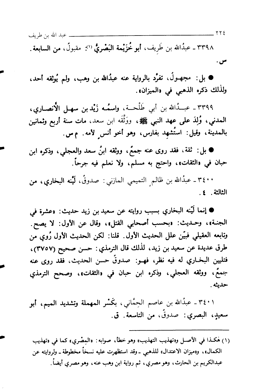 3398 - عبدُ الله بن طَرِيف، أبو خُزَيْمة البَصْريُّ (¬1): مقبولٌ، من السابعة. س.