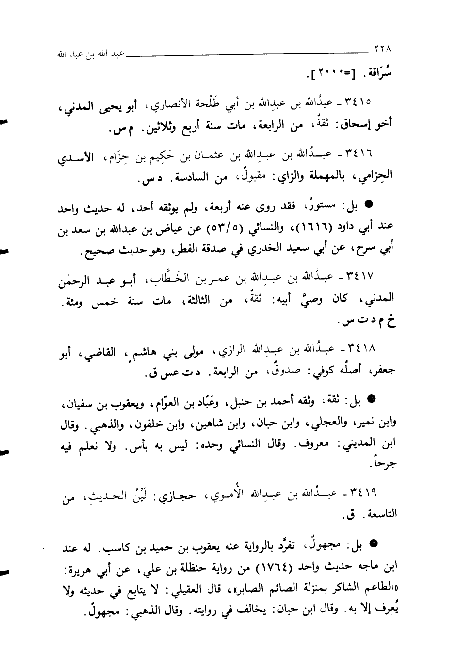 3416 - عبدُ الله بن عبدِ الله بن عثمان بن حَكِيم بن حِزَام، الأسدي الحِزامي، بالمهملة والزاي: مقبول، من السادسة. د س.