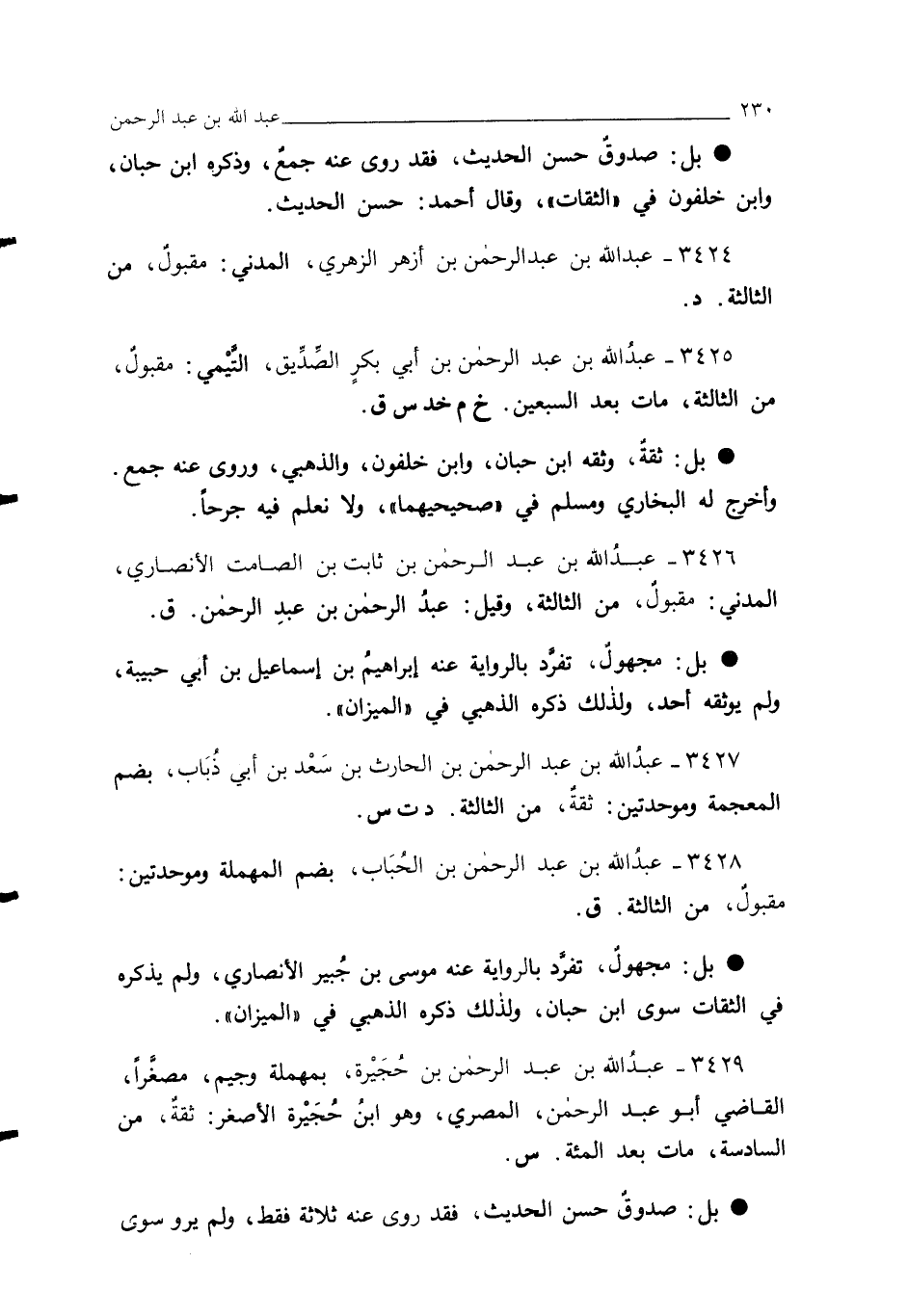 3426 - عبدُ الله بن عبد الرحمن بن ثابت بن الصامت الأنصاري، المدني: مقبولٌ، من الثالثة، وقيل: عبدُ الرحمن بن عبدِ الرحمن. ق.