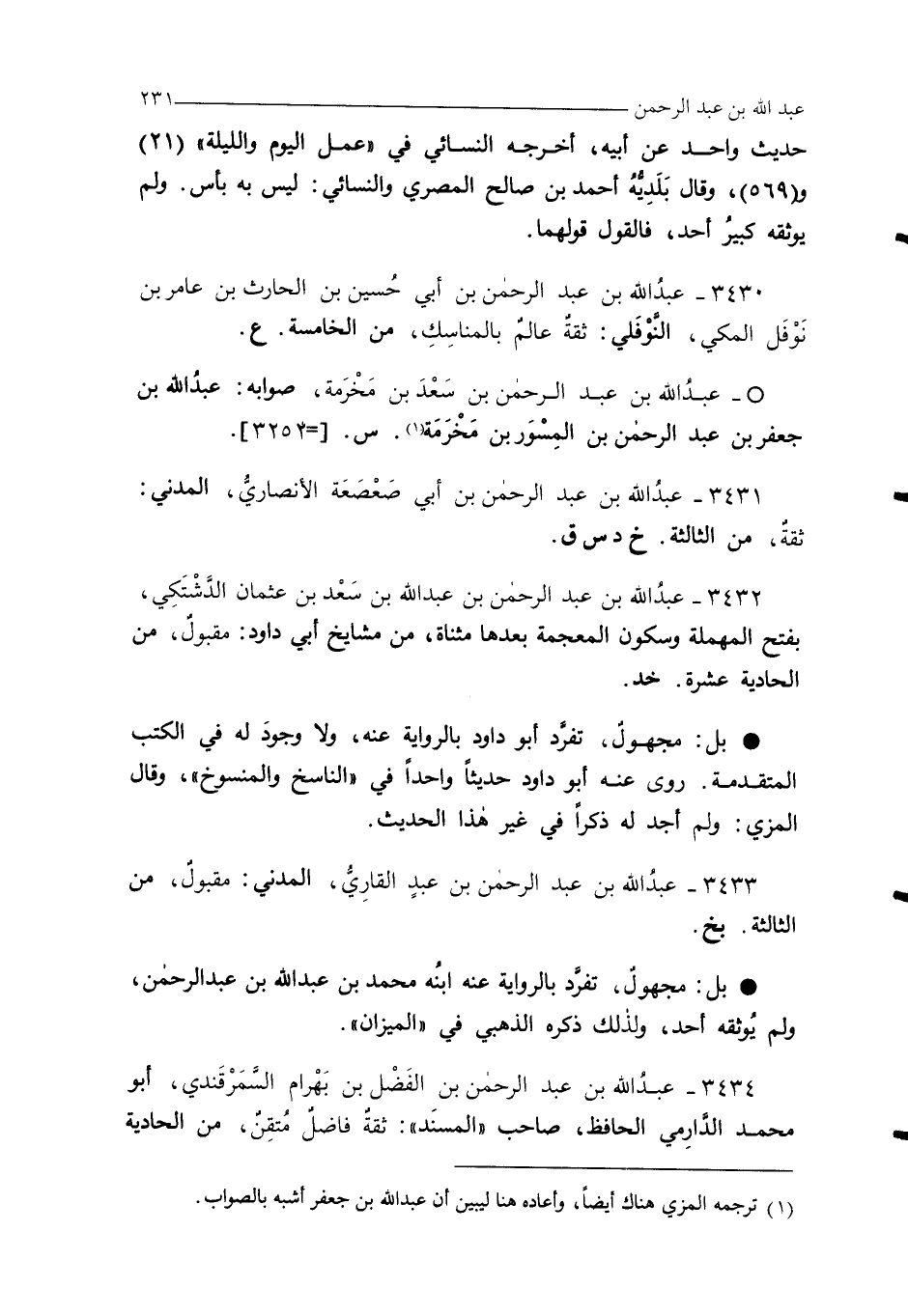 3433 - عبدُ الله بن عبد الرحمن بن عبدٍ القارِيُّ، المدني: مقبولٌ، من الثالثة. بخ.