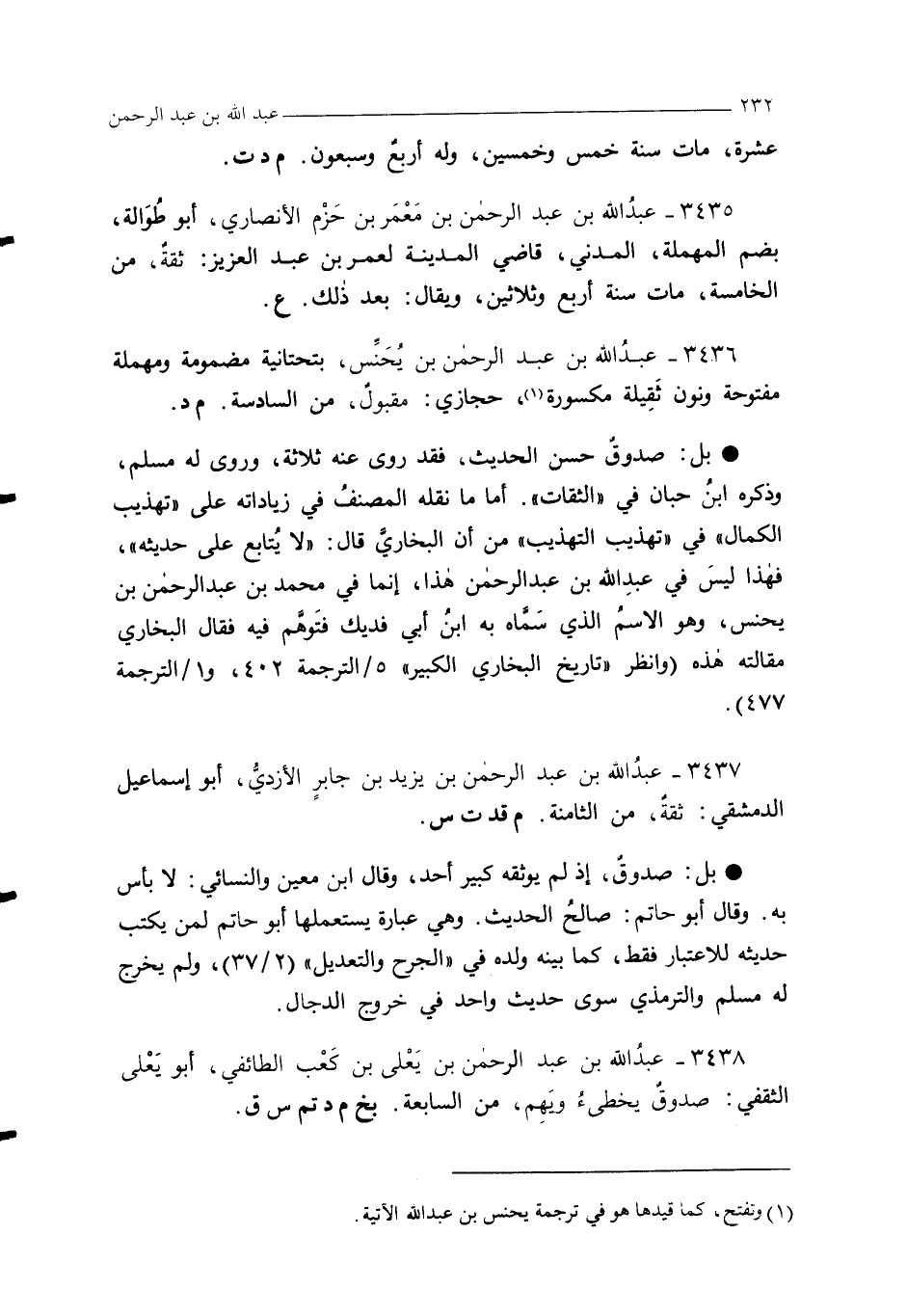 3437 - عبدُ الله بن عبد الرحمن بن يزيد بن جابرٍ الأزديُّ، أبو إسماعيل الدمشقي: ثقةٌ، من الثامنة. م قد ت س.