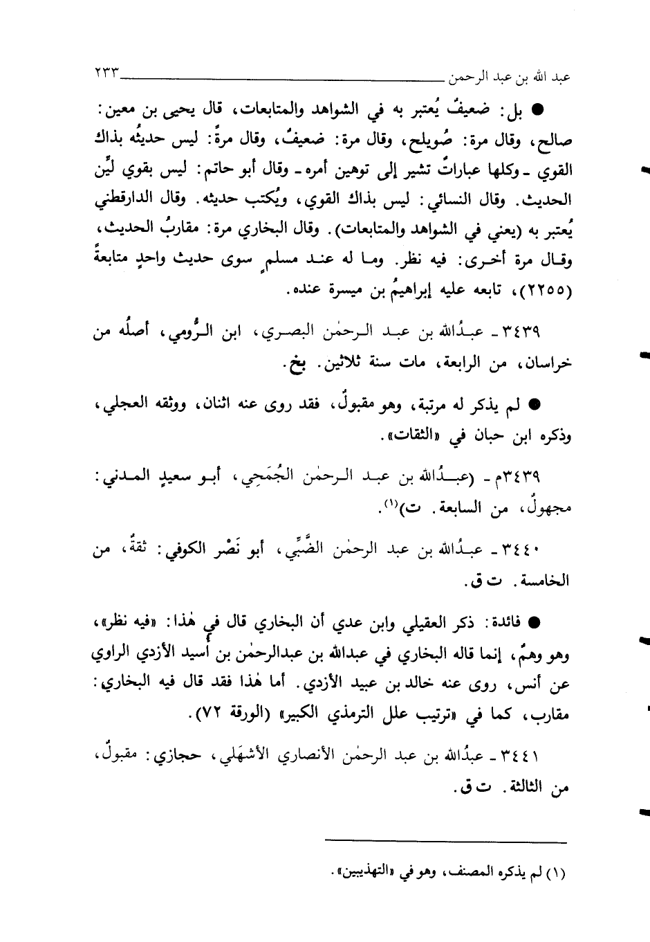 3439 - عبدُ الله بن عبد الرحمن البصري، ابن الرُّومي، أصلُه من خراسان، من الرابعة، مات سنة ثلاثين. بخ.