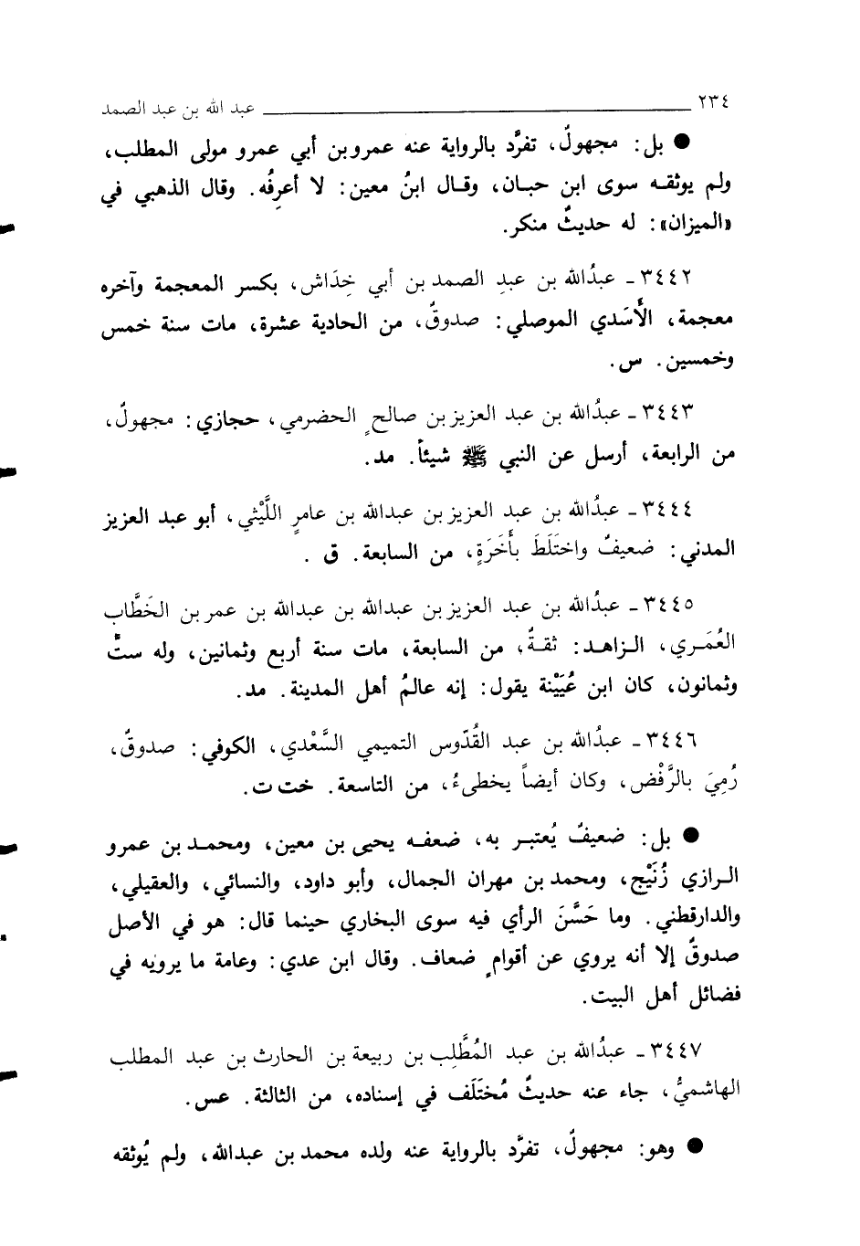 3444 - عبدُ الله بن عبد العزيز بن عبد الله بن عامرٍ اللَّيْثي، أبو عبد العزيز المدني: ضعيفٌ واختَلَطَ بأخَرَةٍ، من السابعة. ق.
