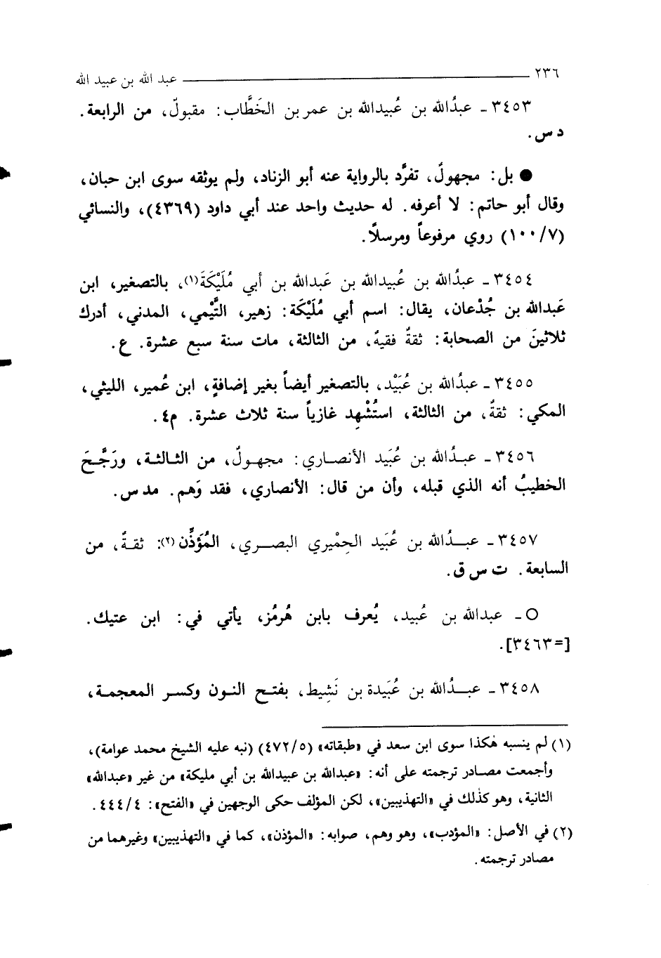 (¬1) لم ينسبه هكذا سوى ابن سعد في "طبقاته" (5/ 472) (نبه عليه الشيخ محمَّد عوامة)، وأجمعت مصادر ترجمته على أنه: "عبد الله بن عبيد الله بن أبي مليكة" من غير "عبد الله" الثانية، وهو كذلك في "التهذيبين"، لكن المؤلف حكى الوجهين في "الفتح": 4/ 444.