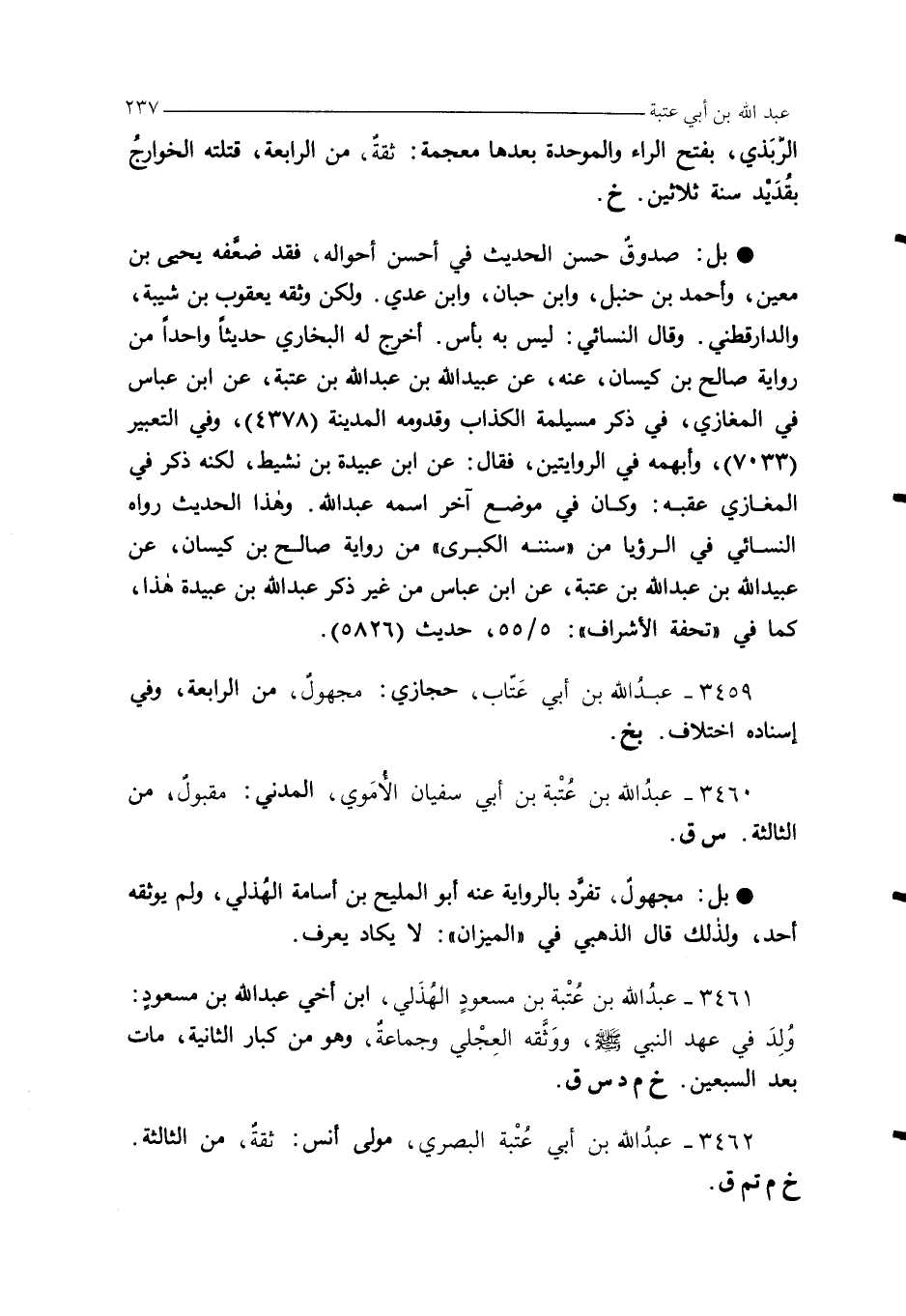 3461 - عبدُ الله بن عُتْبة بن مسعودٍ الهُذَلي، ابن أخي عبد الله بن مسعودٍ: وُلِدَ في عهد النبي - صلى الله عليه وسلم -، ووَثَّقه العِجْلي وجماعةٌ، وهو من كبار الثانية، مات بعد السبعين. خ م د س ق.
