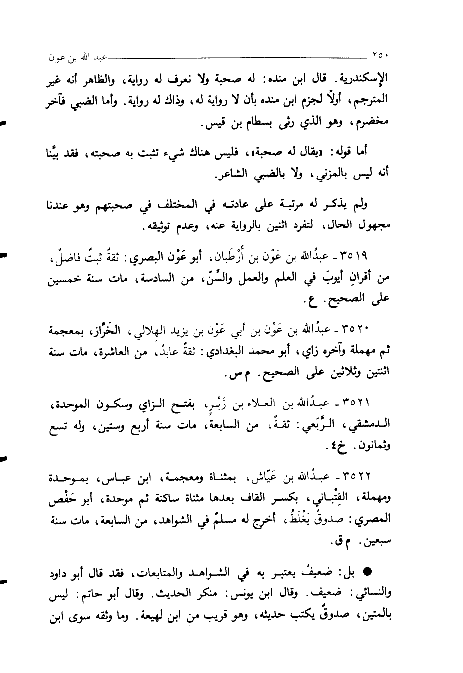 3519 - عبدُ الله بن عَوْن بن ارطَبان، أبو عَوْن البصري: ثقة ثبتٌ فاضلٌ، من أقرانِ أيوبَ في العلم والعمل والسِّنّ، من السادسة، مات سنة خمسين على الصحيح. ع.