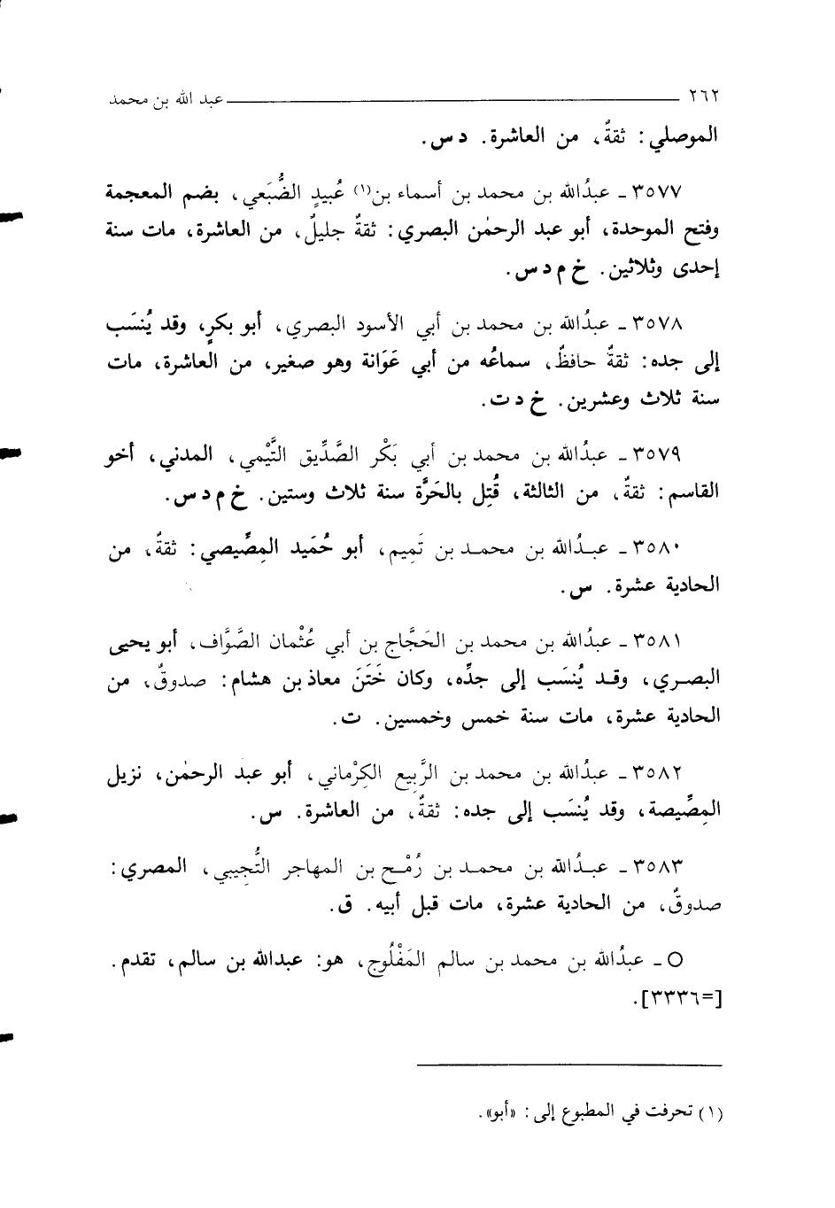 3580 - عبدُ الله بن محمد بن تَمِيم، أبو حُمَيد المِصِّيصي: ثقةٌ، من الحادية عشرة. س.