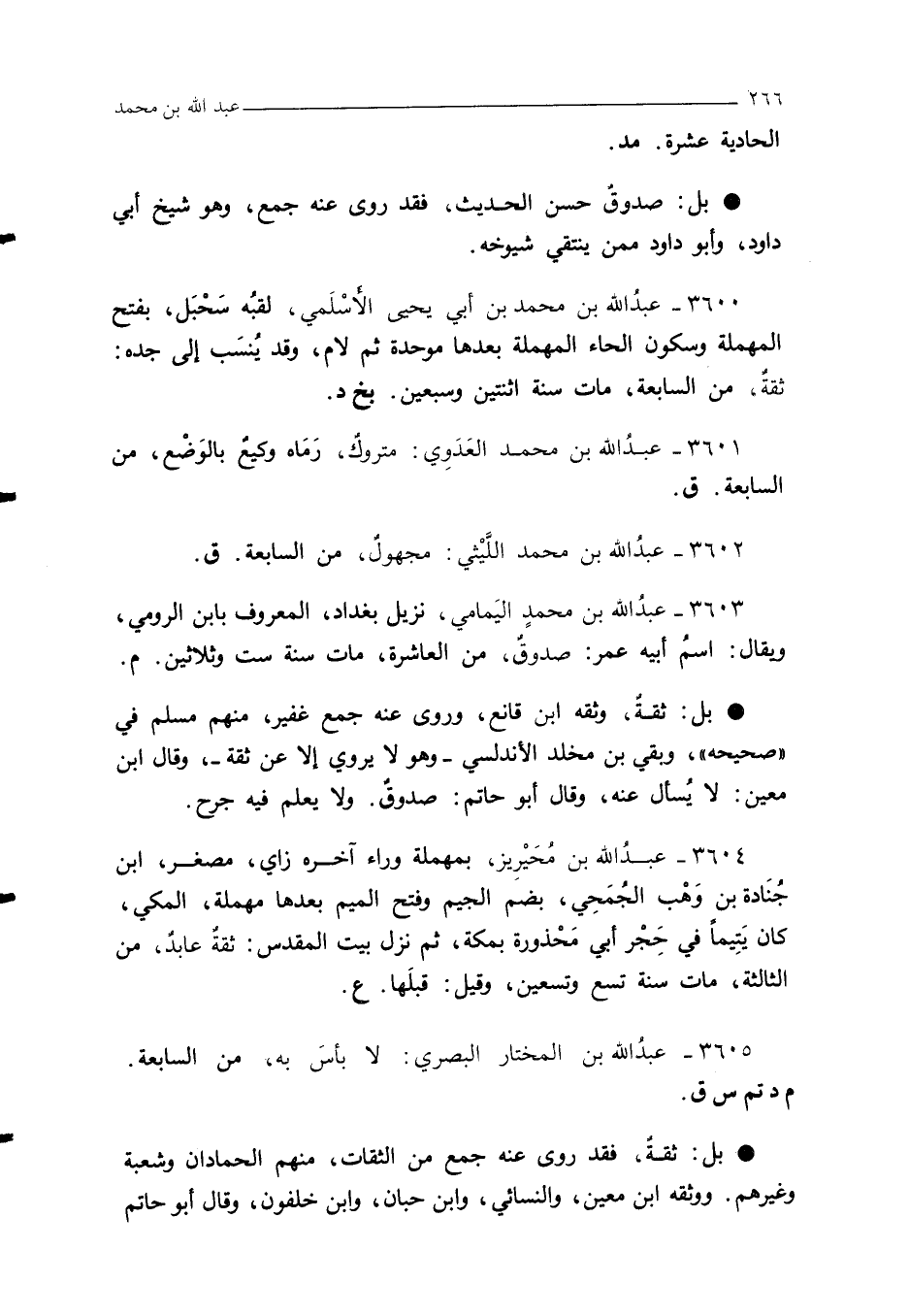 3601 - عبدُ الله بن محمد العَدَوِي: متروكٌ، رَمَاه وكيعٌ بالوَضْع، من السابعة. ق.