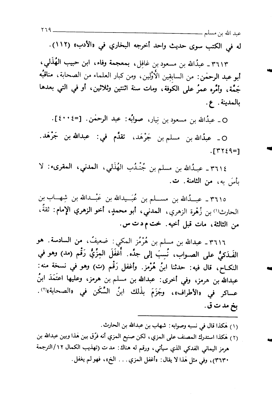 3616 - عبد الله بن مسلم بن هُرْمُز المكي: ضعيفٌ، من السادسة. هو الفَدَكيُّ على الصواب، نُسِبَ إلى جدِّه. أَغفَلَ المِزِّيُّ رَقْم (مد) وهو في النكاح، قال فيه: حدثنا ابنُ هُرْمز. وأغفل رَقْم (ت) وهو في نسخة منه: عبد الله بن هرمز، وفي أخرى: عبد الله بن مسلم بن هرمز، وعليها اعتَمَدَ ابنُ عساكر في "الأطراف"، وجَزَمَ بذلك ابنُ السَّكَن في "الصحابة" (¬2). بخ مد ت ق.